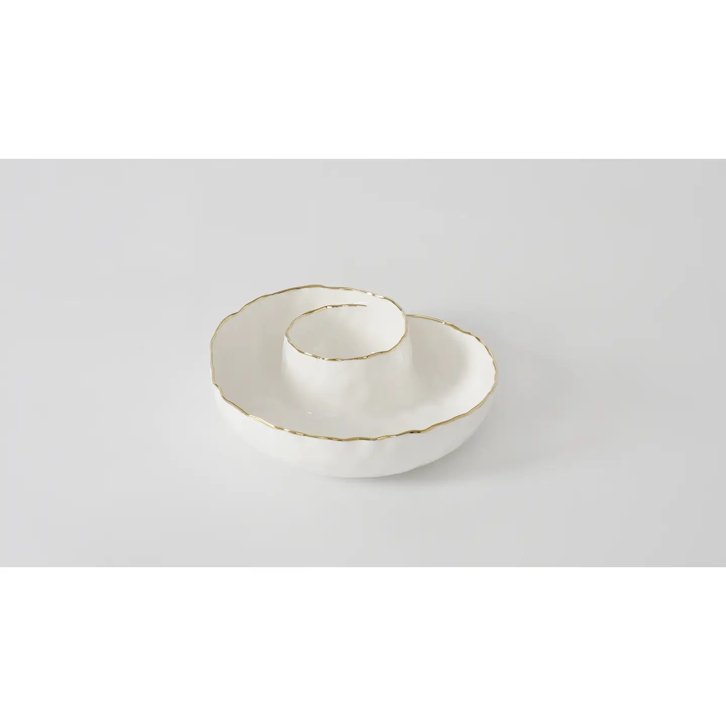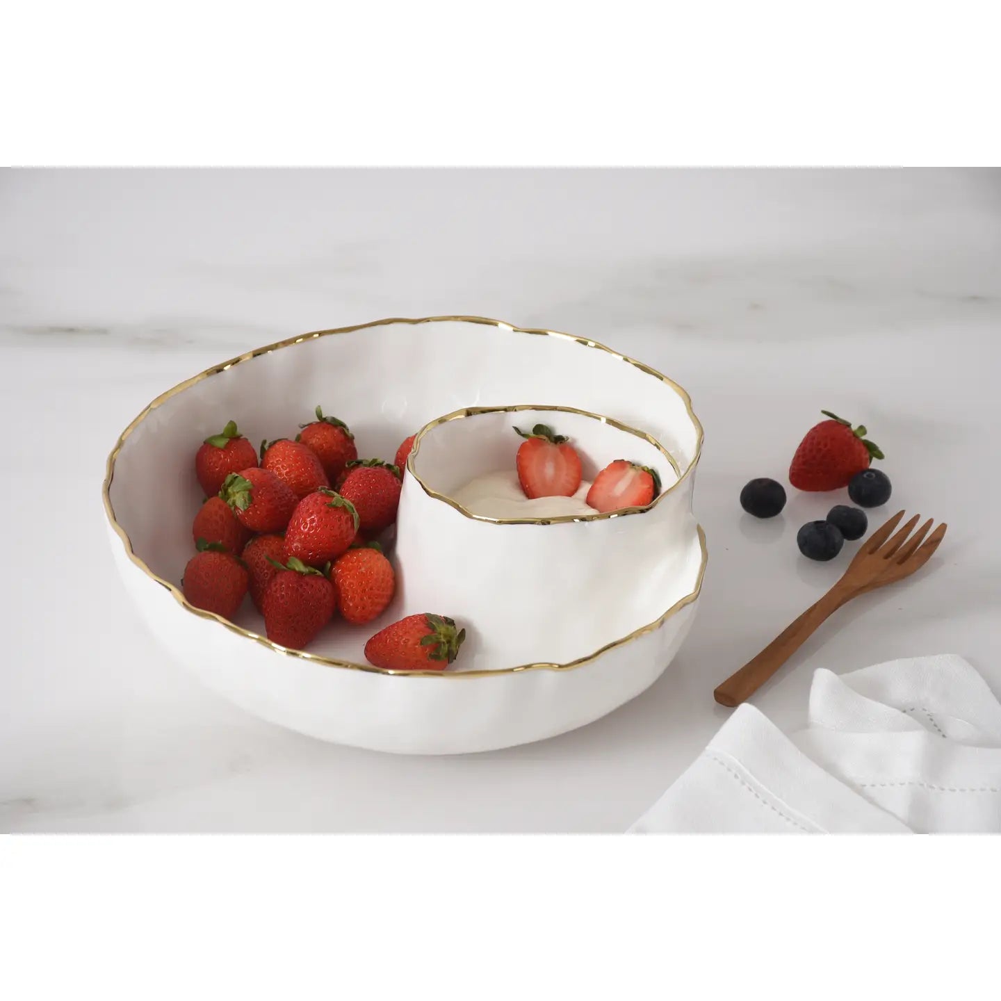 Chip and Dip in our Portofino Collection. Perfect for any dip combo : hummus and pita, salsa and tortilla chips, veggies and ranch or our favorite berries and whipped cream! Gorgeous white porcelain with a delicate gold trim. Food safe, tarnish free, dishwasher safe, oven safe to 500°. Easy Care.